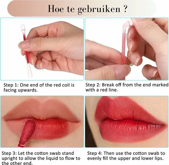 De Bellive tattoo lipstick is zeer eenvoudig aan te brengen dankzij het ontwerp met wattenstaafje. Je hoeft enkel het wattenstaafje te breken langs de gemarkeerde rode lijn. Vervolgens laat je het wattenstaafje rechtop staan zodat de vloeistof naar het andere uiteinde kan stromen. Vervolgens breng je met dit uiteinde de lipstick op jouw lippen aan. Voil?!