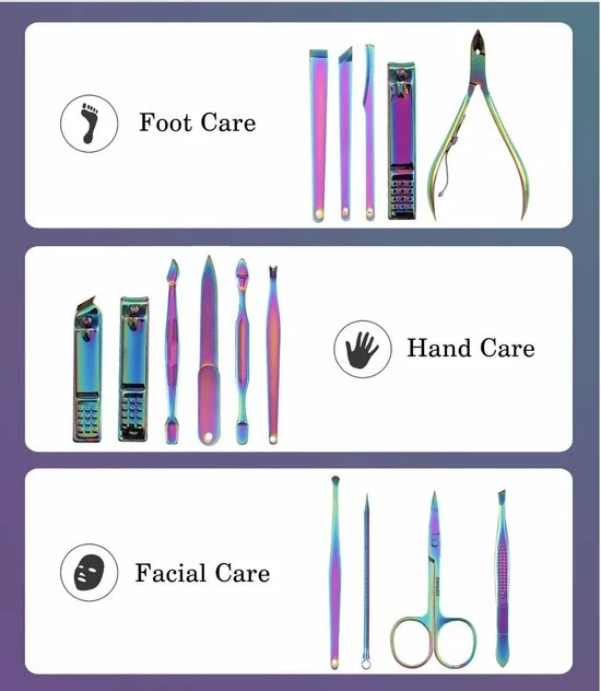 De Jiloma Manicure set bevat 15 verschillende soorten tools geschikt voor je dagelijkse verzorging, waaronder handverzorging, gezichtsverzorging en voetverzorging. Deze manicure/pedicure set heeft alles wat je nodig hebt. Met luxe opbergetui, ideaal voor zowel mannen als vrouwen.