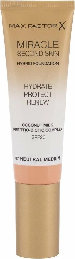 Max Factor Miracle Second Skin Foundation vervaagt imperfecties en geeft de huid een egale teint. Tegelijkertijd levert het bescherming en is de foundation verrijkt met huidvriendelijke voedingsstoffen zoals kokosmelk, glycerine en alo? vera. De Max Factor Miracle Second Skin Foundation helpt de huid in balans te brengen en maakt de huid net zo mooi als de binnenkant!