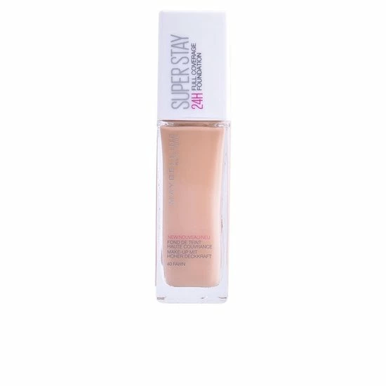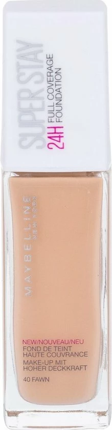 SuperStay 24H Full Coverage Foundation heeft onze hoogste dekking voor een super egale uitstraling van de huid die dag en nacht blijft zitten ? tot 24 uur. De langhoudende foundation bedekt imperfecties tot 24 uur lang zonder een maskereffect. De Maybelline foundation vervaagt niet ?n is waterproof voor een flawless finish, w?t het weer je ook brengt. De formule is daarnaast olievrij waardoor pori?n niet worden verstopt. Zo ervaar jij de superkracht van make-up met de SuperStay Full Coverage foundation 040 Fawn van Maybelline New York!
