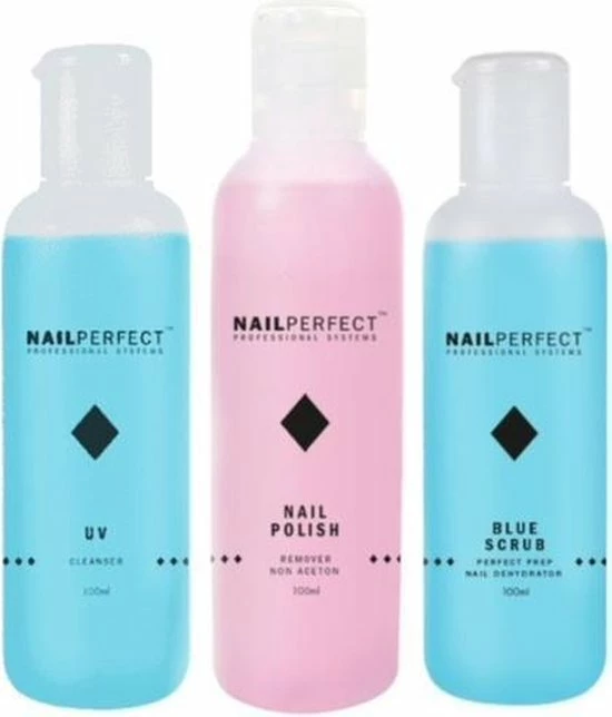 Een voordeel verpakking met 3 verschillende essentiele nagel vloeistoffen voor het voorbereiden van Gel Nagels en voor het verwijderen van de Gel Nagels.