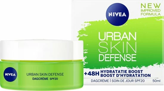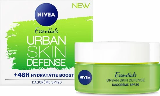 NIVEA® Essentials URBAN SKIN DEFENSE +48H HYDRATATIE BOOST Dagcrème is speciaal ontwikkelt voor de overbelaste huid veroorzaakt door een drukke en snelle levensstijl. De dagcreme met lichte textuur biedt 48 uur lange hydratatie en bevat natuurlijke effectieve antioxidanten. Het biologische Groene Thee extract, Hyaluronzuur en SPF 20 beschermen de huid tegen de invloeden van buitenaf en vroegtijdige huidveroudering.