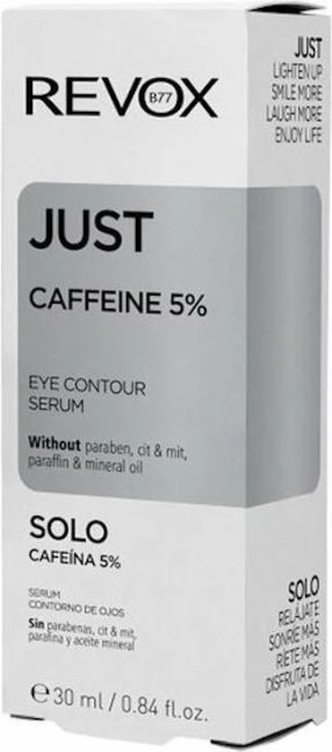 Revox Just Caffeine is een serum speciaal ontwikkeld het gebied onder je ogen. Last van donkere kringen, een rijpe of doffe huid? Dan is dit serum precies wat je huid nodig heeft. Onze huid krijgt veel te verduren wat gezwollen en donkere kringen tot gevolg kan hebben. Cafe?ne is het geheime ingredi?nt in dit serum en zorgt ervoor dat de bloedvaten samen trekken en helpt het uiterlijk van die vervelende kringen te verminderen.Daarnaast is dit serum ook verrijkt met groene thee de huid extra beschermt en de tekenen van huidveroudering vermindert. Dit serum is vrij van paraffine en minerale oli?n.Dit serum : Speciaal ontwikkeld voor het gebied onder je ogen. Vermindert zwellingen en donkere kringen. Bevat cafe?ne en groene thee. Helpt de bloedvaten samen te trekken. Beschermt de huid. Vermindert tekenen van huidveroudering. Vrij paraffine en minerale oli?n. Cruelty free.;How to use : Het serum goed schudden voor gebruik. Breng eerst eerst een serum op waterbasis aan. Masseer een paar druppeltjes in je huid. Nu kun je je makeup aanbrengen.Tip! :;Gebruik zowel ‘s morgens als ‘s avonds voor het beste resultaat! Combineer dit serum niet met glycolzuur, want dit kan de werking van cafe?ne verminderen.Ingredi?nten :Aqua, Caffeine, Propylene Glycol, Camellia Sinensis Leaf Extract, Xanthan Gum, Phenoxyethanol, PPG-1-PEG-9 Lauryl Glycol Ether, Disodium EDTA.Inhoud :;30 ml.