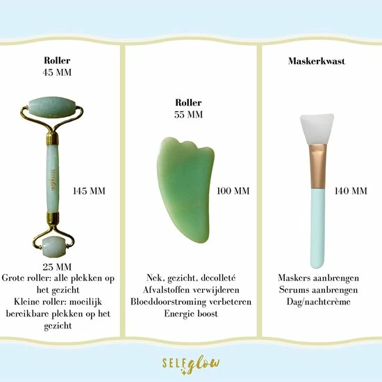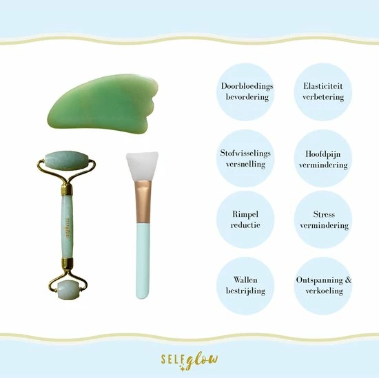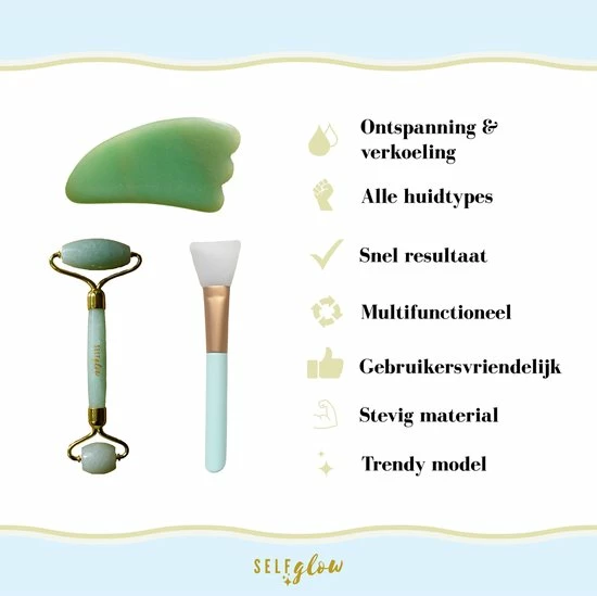 Onze 100% jade edelsteen staat bekend om haar helende energie die jouw een zelfvertrouwen boost gaat geven. Ons unieke alles-in-??n pakket van Self Glow zorgt dat je op lastig bereikbare plekken gemakkelijk kan masseren om jouw huid weer te laten stralen!