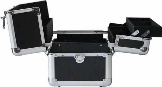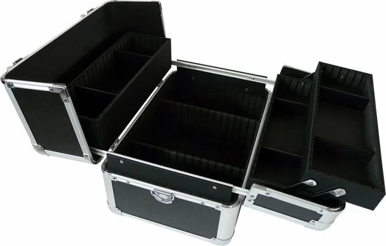De beautycase is voorzien van een handgreep en is volledig 3-vaks uitklapbaar. Onder deze uitschuifbare vakken is tevens een ruim ondervak, die voldoende plaats biedt, bijvoorbeeld voor u nagel lamp of nagelfrees. Ook zijn zowel de uitschuifbare vakken, als het ondervak voorzien van indeelwanden. Deze kunt u zelf inrichten. Verder is het binnenwerk van deze aluminium beautycase bekleedt met zwart traagschuim, die uw producten of eigendommen perfect beschermt.