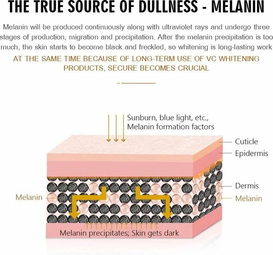 In de loop van de tijd veroorzaken intrinsieke (natuurlijke) en extrinsieke (milieu) factoren structurele veranderingen in de huid, wat leidt tot ongelijkmatige pigmentatie. Van “ouderdomsvlekken” door UV-schade, tot post-inflammatoire hyperpigmentatie, donkere vlekken zijn geen partij voor Vitamine C. Het stopt namelijk de biochemische reacties die ongelijke pigmentatie veroorzaken, en helpt zo de huid effectief te verhelderen