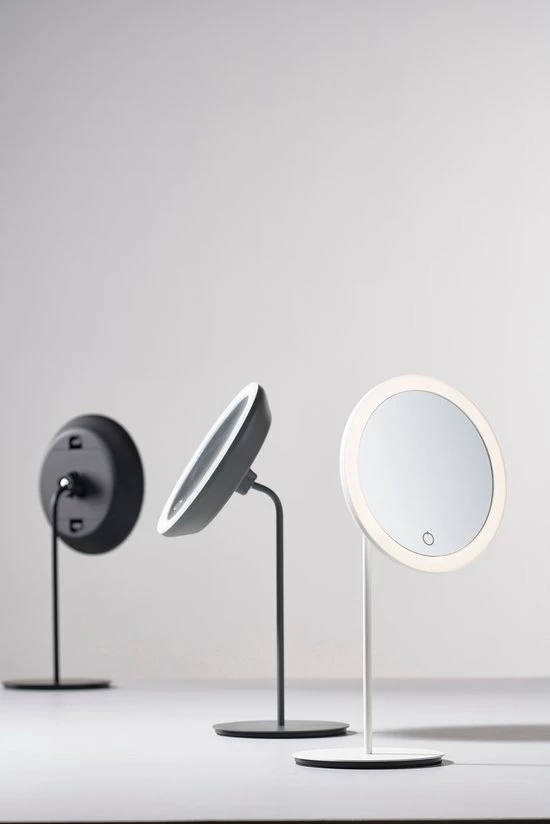 Een goede spiegel doet wonderen als het gaat om indoen van contactlenzen, opdoen van make-up of het scheren! Deze mooie tafelspiegel van Zone Denmark biedt dat wonder. De spiegel heeft namelijk meerder snufjes! Hij vergroot uit tot 5x maar dat niet alleen! Je kan de spiegel in 3 lichtstanden zetten; cool wit licht, natuurlijk licht of warm wit licht. Daarnaast is de spiegel wendbaar en kan je hem dus makkelijk in de juiste stand zetten. Na 10 minuten schakelt de spiegel automatisch het lampje uit. Hoe gemakkelijk! Je kan kiezen uit 3 kleuren, de metalen spiegel is er in het zwart, grijs en wit. Gebruik hem in je badkamer, slaapkamer of misschien wel op het kastje in de hal. Veel plezier ermee!